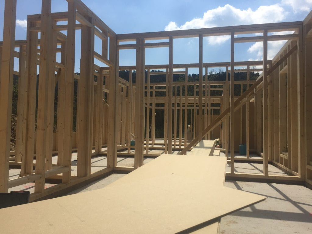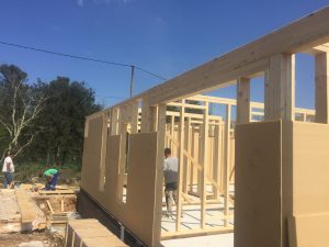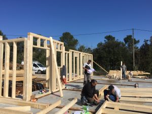 Mur, après mur, la maison va ainsi sortir de terre, pour faire apparaître l’ensemble de la structure porteuse (certain l’appelle le squelette) de l’ossature bois.