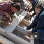 Nous procédons ensuite à l’assemblage du premier mur. Un montage à blanc se réalise sur le sol, à l’horizontal. Les bois nécessaires sont rassemblés, puis agencés pour prendre la forme de la future structure. Ces bois sont ensuite emboités les uns dans les autres (des encoches d’assemblage sont positionnées sur les bois par le robot de coupe à l’usine, ce qui nous permet de réaliser sur le chantier :