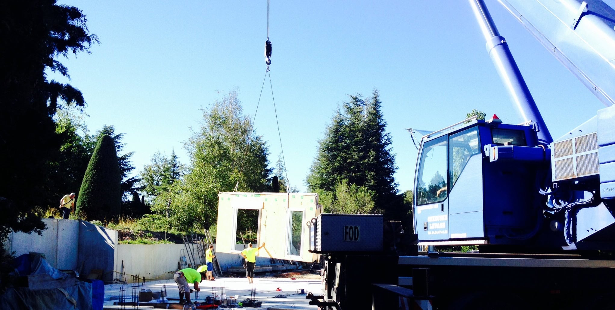 Alors pour travailler rapidement, dans de belles conditions techniques sur des terrains éloignés de grands axes, nous construisons comme dans ce chantier nos maisons par éléments modulaires.