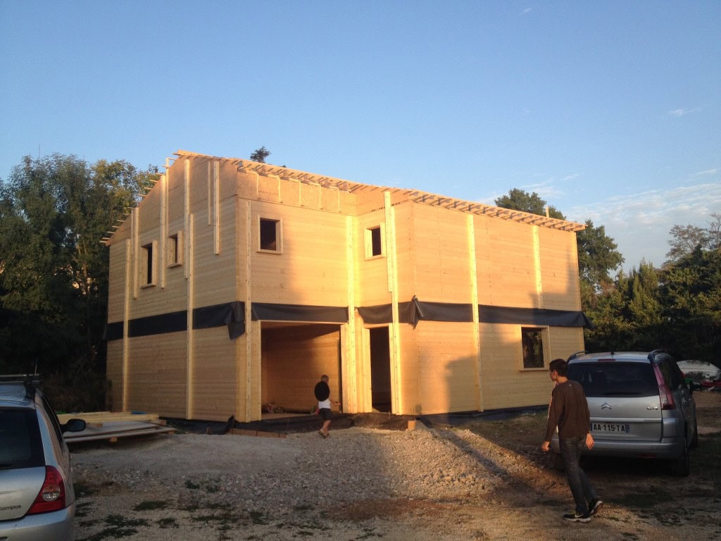 Nous avançons même assez vite sous l’impulsion des équipes de montage, très motivées par l’idée de construire sur Marseille même (une partie de l’équipe est Marseillaise, et habite près de la Timone). L’équipe de montage de nos maisons en bois en est à l’heure où je vous parle à un hors d’eau. Les murs sont en place sur les 2 niveaux et la toiture (fermettes et tuiles ) vient d’être terminée par les couvreurs de la société GTM 83.