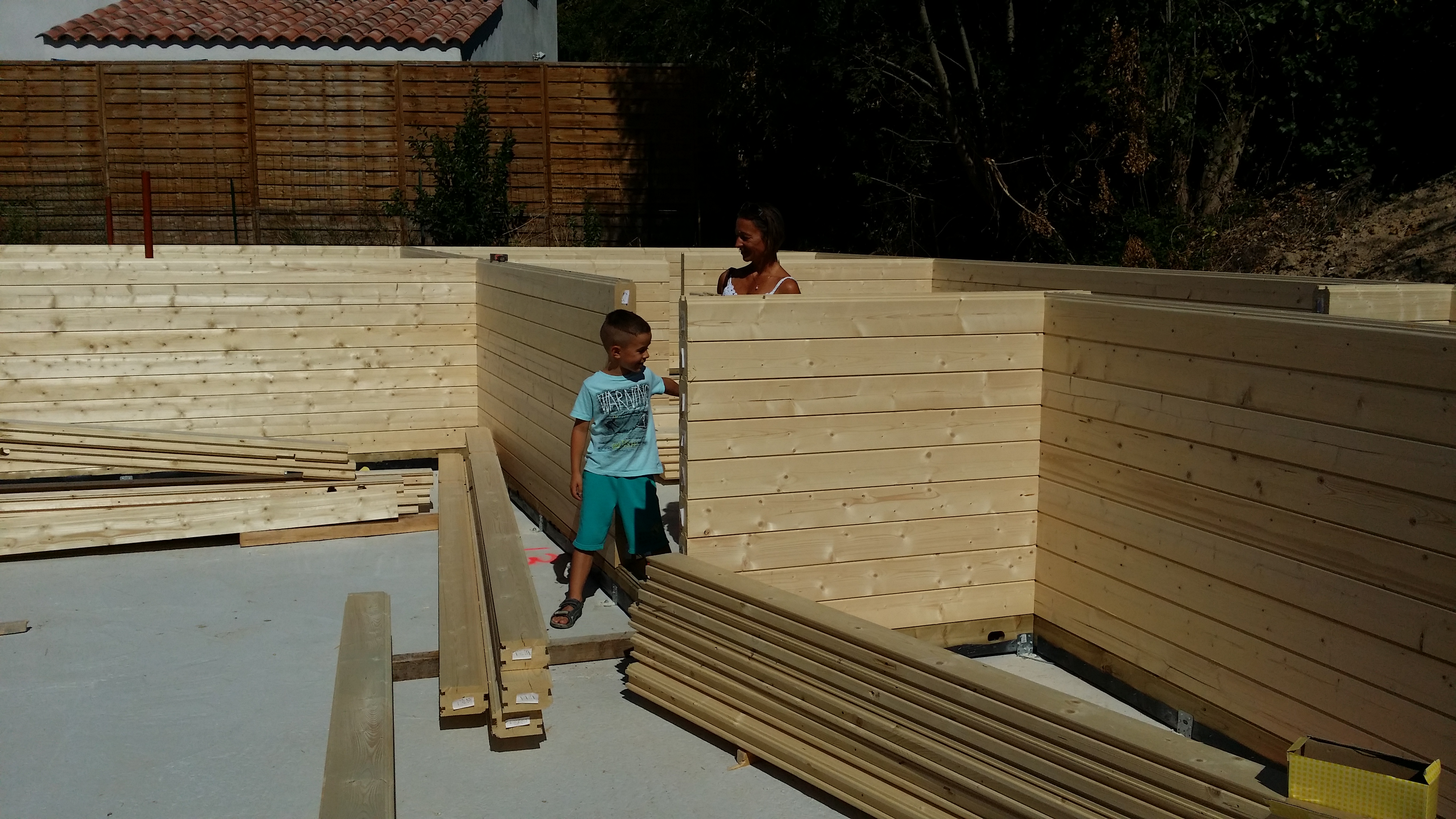 Ainsi, avec une massette, une paire de gants, des chaussures de sécurité et une visseuse efficace le travail progresse vite et les murs grimpent à vue d’œil, madrier après madrier.